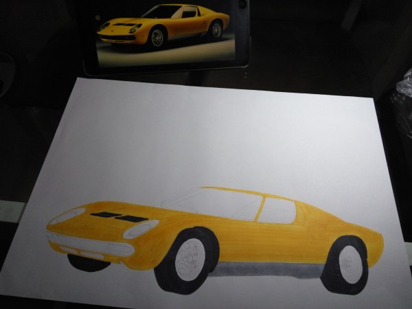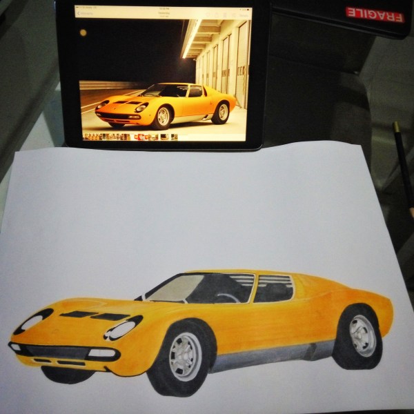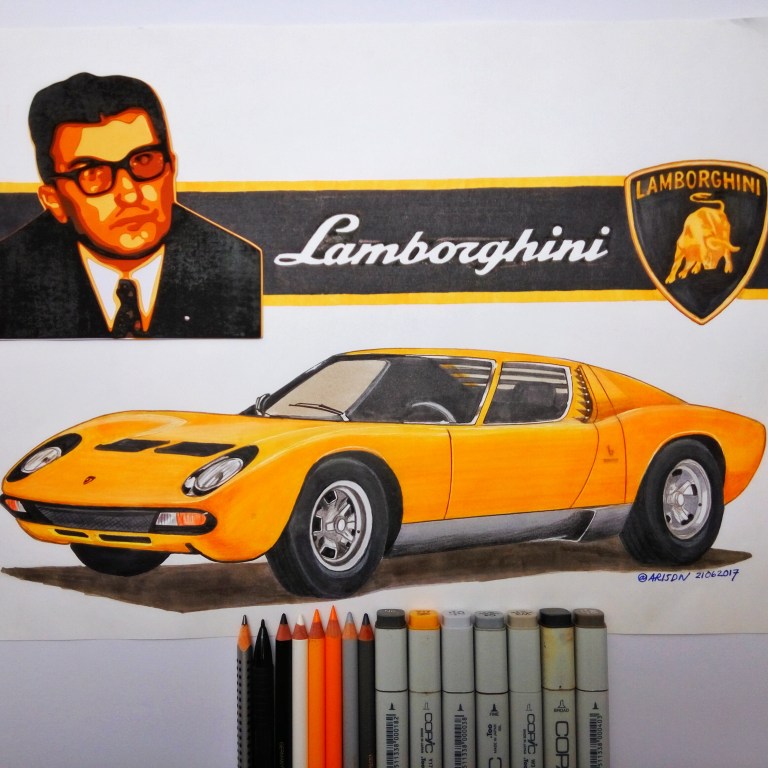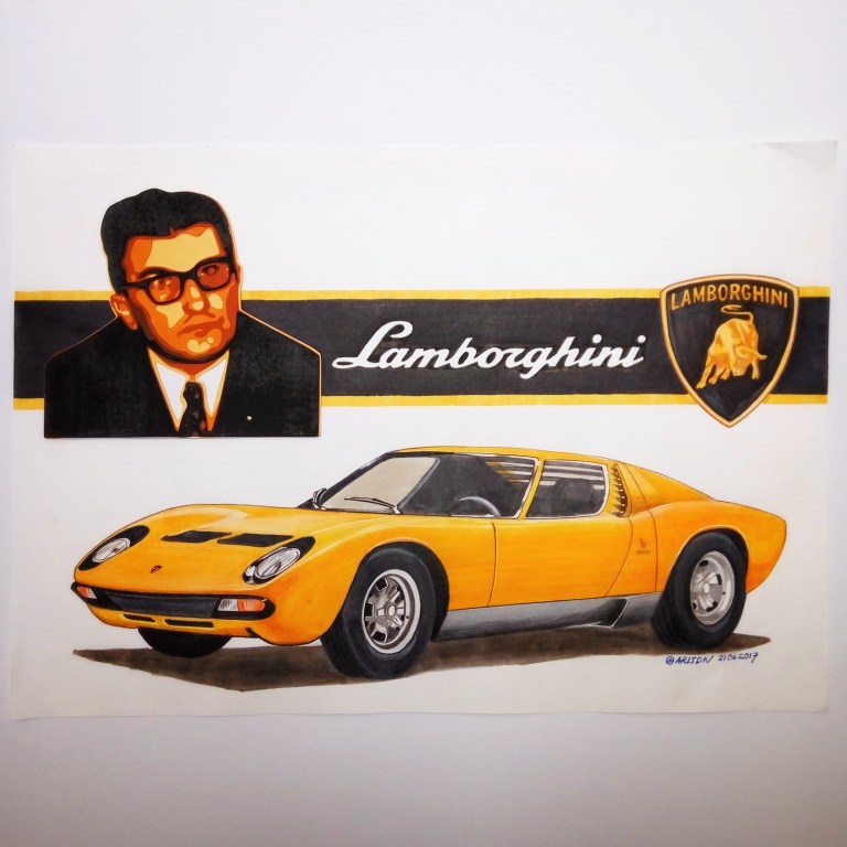 The other car brand that I love is Lamborghini. This brand is consistent to create superb and spectacular car body design and set the high benchmark to other competitors. And if we follow the history of how this car was built, we will admire the spirit and passion of the founder, Ferruccio Lamborghini. Even though he and his team have no experience to build a sports car, but finally they can write the history with their golden ink. To share my admiration for Mr. Lamborghini passion, I made this artwork. This artwork is quite unique because I combine the paper cutting technique for the portrait with marker & pencil color rendering. From many cars of Lamborghini, I simply choose Lamborghini Miura that designed by Bertone. It has a simple and sexy design.
