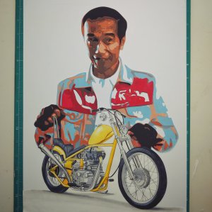Kenapa harus potret Pak Joko Widodo dengan jaket denim dan chopper? Karena saya ingin menampilkan sosok Pak Joko Widodo sebagai personal, sebagai manusia Indonesia yang mencintai tanah airnya, sebagai manusia biasa yang juga punya hobby. Jaket denim dengan desain yang menurut saya sangat bagus dan menggambarkan keragaman Indonesia, bisa menggambarkan kecintaan beliau kepada Indonesia. Sebagai manusia biasa yang punya kegemaran atau hobby, meski beliau adalah tokoh yang super sibuk karena posisinya sebagai Presiden Republik Indonesia, Pak Joko Widodo tak sungkan menampilkan dirinya apa adanya. Gandrung musik rock dan mengidolakan berbagai grup rock/metal, mengendarai chopper, bergaya pakaian casual adalah personal-brand yang melekat pada beliau. Dan ini yang ingin saya tampilkan. Joko Widodo sebagai Joko Widodo.