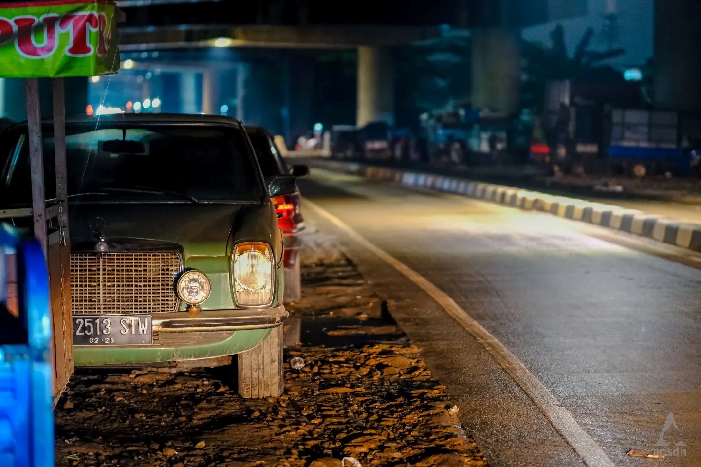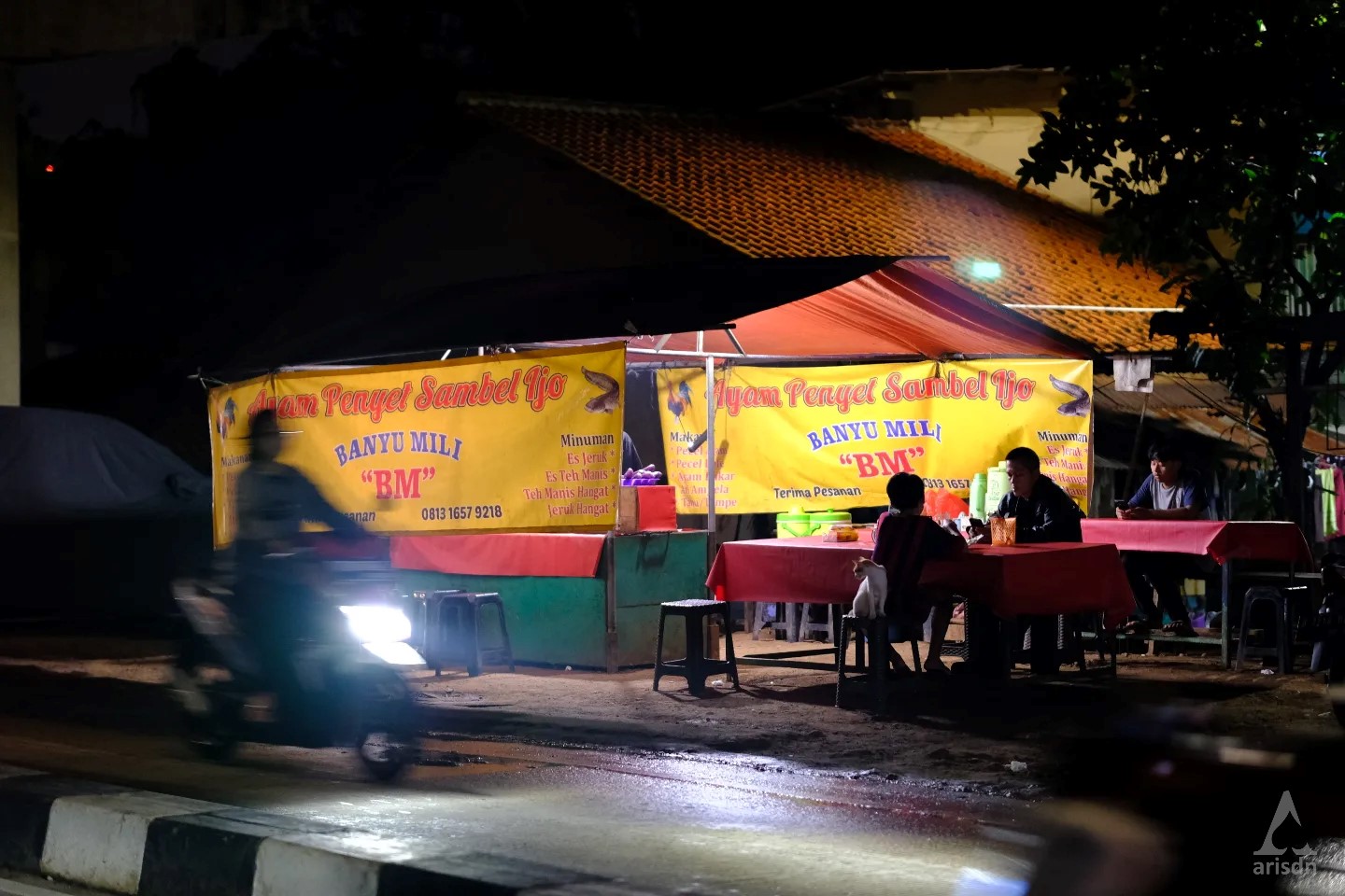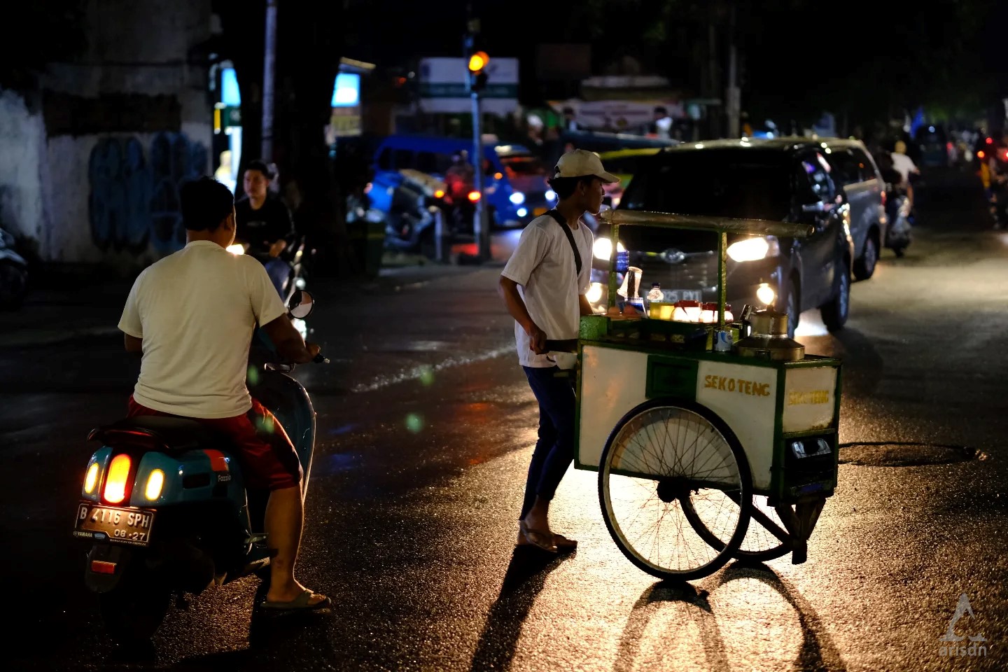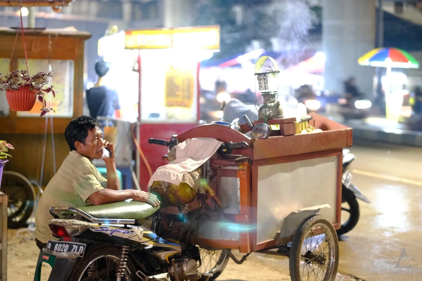 Namanya Pak Kadi. Beliau jualan jagung rebus dan kacang rebus, yang mangkal di dekat pertigaan Margasatwa, Pondok Labu. Langganan saya kalau lagi pengen ngemil kacang buat nonton film di rumah. Kebetulan malam minggu kemarin saya muter-muter manasin sepeda dan kamera. Sebelum pulang, saya mampir beli kacang dan jagung. Dan atas ijinnya, saya foto-foto aktivitasnya. Entah kenapa dia spontan ngeluarin gaya jempol dan senyum lebarnya. Selesai urusannya, saya pulang.