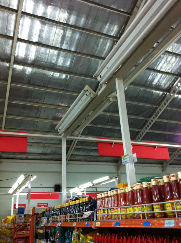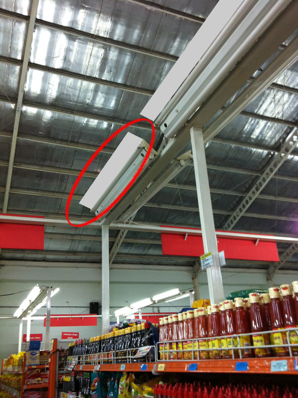 The purpose of using this lighting system on the store (shown on photo) is absolutely for highlight the products that displayed and also for general lighting at the store. Without using reflector, they want achieves more light and create brighter store. But, I think they are forget that most of lighting that produce by lamps are used to highlight the ceiling and transferred to roof. So it will useless.