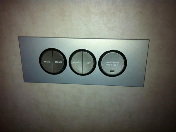 below : lighting scene controller near bed. there are 4 lighting scene : hello, escape, runway and flirt. and one button for master off/night light.